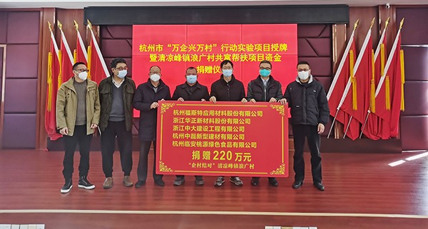 12月21日,杭州市“萬企興萬村”行動實驗項目授牌暨清涼峰鎮浪廣村共富幫扶項目資金捐贈儀式在清涼峰鎮政府舉行。杭州市工商聯黨組成員、二級巡視員毛???,區委常委、統戰部長陳娜,區人大原副主任、慈善總會會長羅石榮,區工商聯黨組書記樓金山,清涼峰鎮黨委書記錢波,區工商聯主席、杭州福斯特應用材料股份有限公司董事長林建華等參加活動。